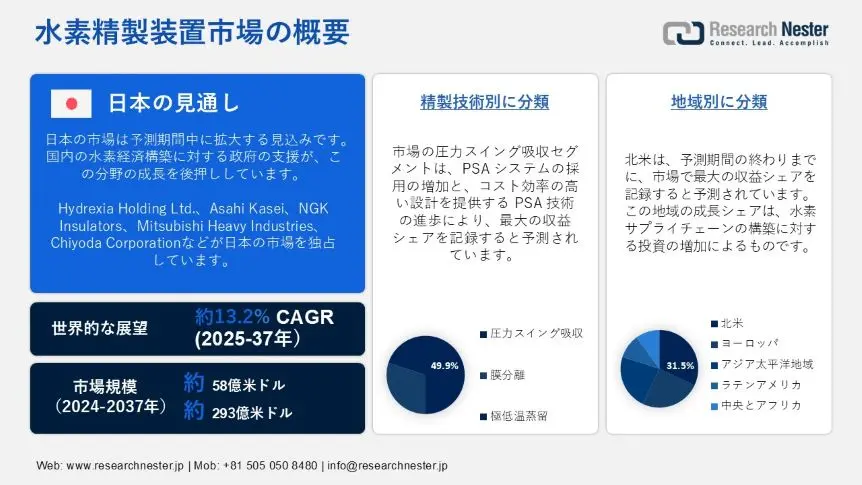 href="https://www.researchnester.jp/industry-analysis/hydrogen-purifier-market/5864">水素精製装置市場は2024年に58億米ドルと評価され、2025―2037年の予測期間中に13.2%のCAGRで成長し、2037年には293億米ドルに達すると推定されています。日本の水素精製機市場は、2025―2037年の予測期間中に堅調な成長を示すと予測されています。